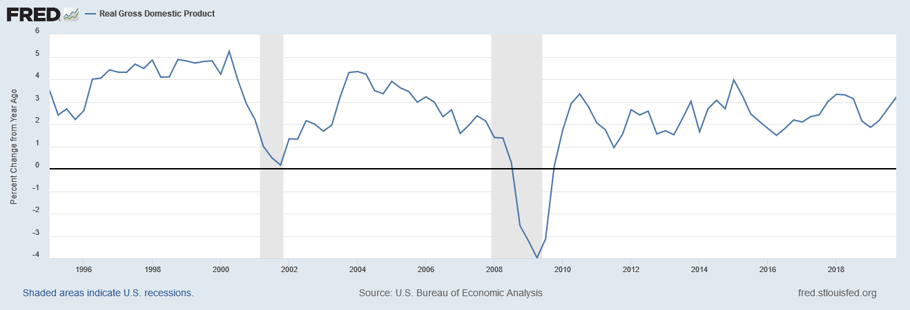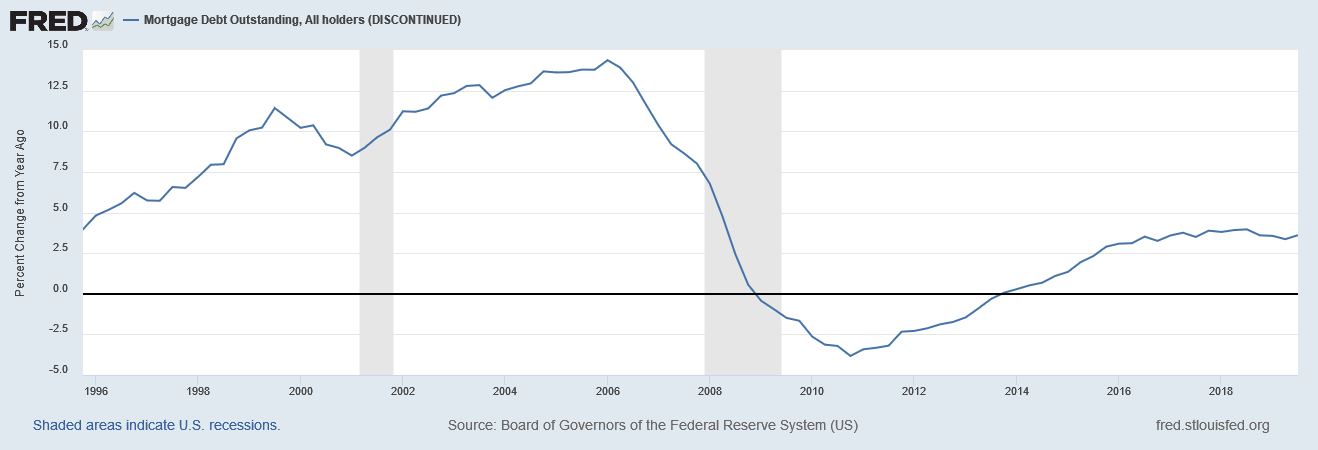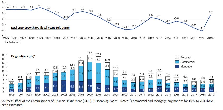The US mainland mirrored Puerto Rico both in terms of growth of the overall economy and mortgage credit. Growth was strong in the second half of the 1990s, there was a recession in 2001, and resumed at a slower pace in the 2000s.