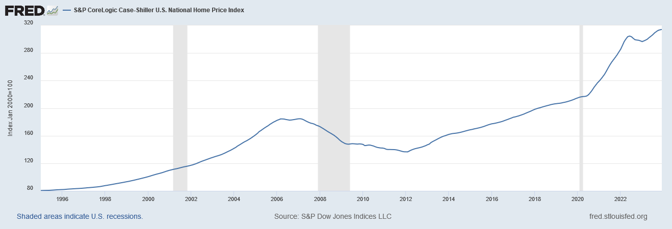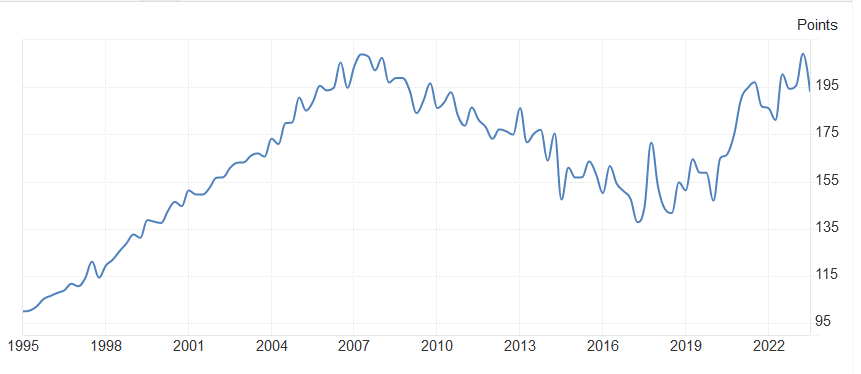 Above we see an index of Puerto Rico house prices. (1995=100) Between 1995 and 2007, prices roughly doubled. Then they started falling, and crucially, kept falling after 2012, the year that house prices in the rest of the US began to recover. Only due to the post COVID housing boom, which also affect Puerto Rico, did house prices finally recovery to nominal levels seen in 2008.