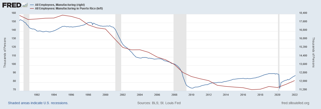 Finally, lets look at employment. Both the US mainland saw little job growth in manufacturing in the 1990, and both experienced a massive decline in manufacturing employment in the 2000s. However, a small recovery began in US manufacturing employment around 2010. On the island, manufacturing jobs simply kept falling, though have recovered somewhat since 2020.