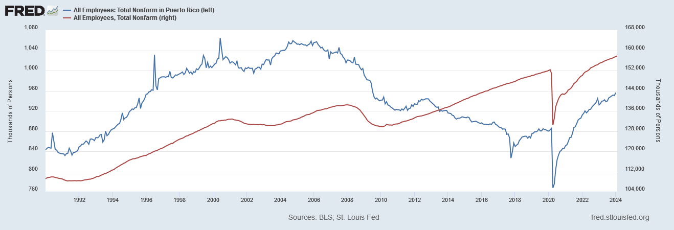 The graphs really only diverge after the great recession. Puerto Rico simply never started to recovery. This is what I have dubbed the Great Decoupling. And strangely enough, post COVID, the economic trends again show a strikingly similar pattern on a variety of economic indicators.